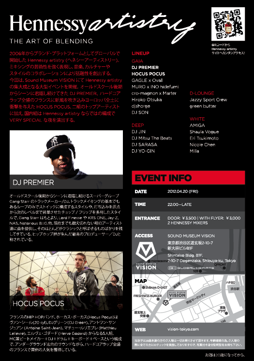オールドスクール後期からシーンに君臨し続けてきたDJ PREMIER、ハードコアラップ全盛のフランスに新風を吹き込みヨーロッパ全土に衝撃を与えたHOCUS POCUS、2組のトップアーティストに加え、国内組はHennessy artistryならではの編成でVERY SPECIALな夜を演出する。