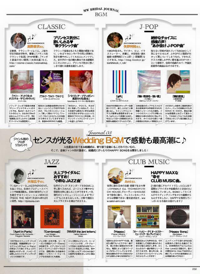 2015/02/202015/03/24に投稿 投稿者 admin — コメントを残す「MISS WEDDING 」2015 S/S号 JAZZ BGM担当してます♡ 発売中 道端ジェシカ 表紙!! 「MISS WEDDING 」2015 S/S号 http://wedding.miss.jp 特集 WEDDING BGM JAZZ 部門を セレクトさせていただきました♡ ぜひご参考に!!本気にセンスあふイイ演出になるはずです(強気w)!!! 投稿ナビゲーション前の投稿: 3/12はリリースライブ@PIT INN スペシャルです!!!次の投稿: 2/24発売 『CLUTCH magazine 』に7p掲載です♡ コメントを残すメールアドレスが公開されることはありません。 ※ が付いている欄は必須項目ですコメント ※ 名前 メール サイト 次回のコメントで使用するためブラウザーに自分の名前、メールアドレス、サイトを保存する。 Δ