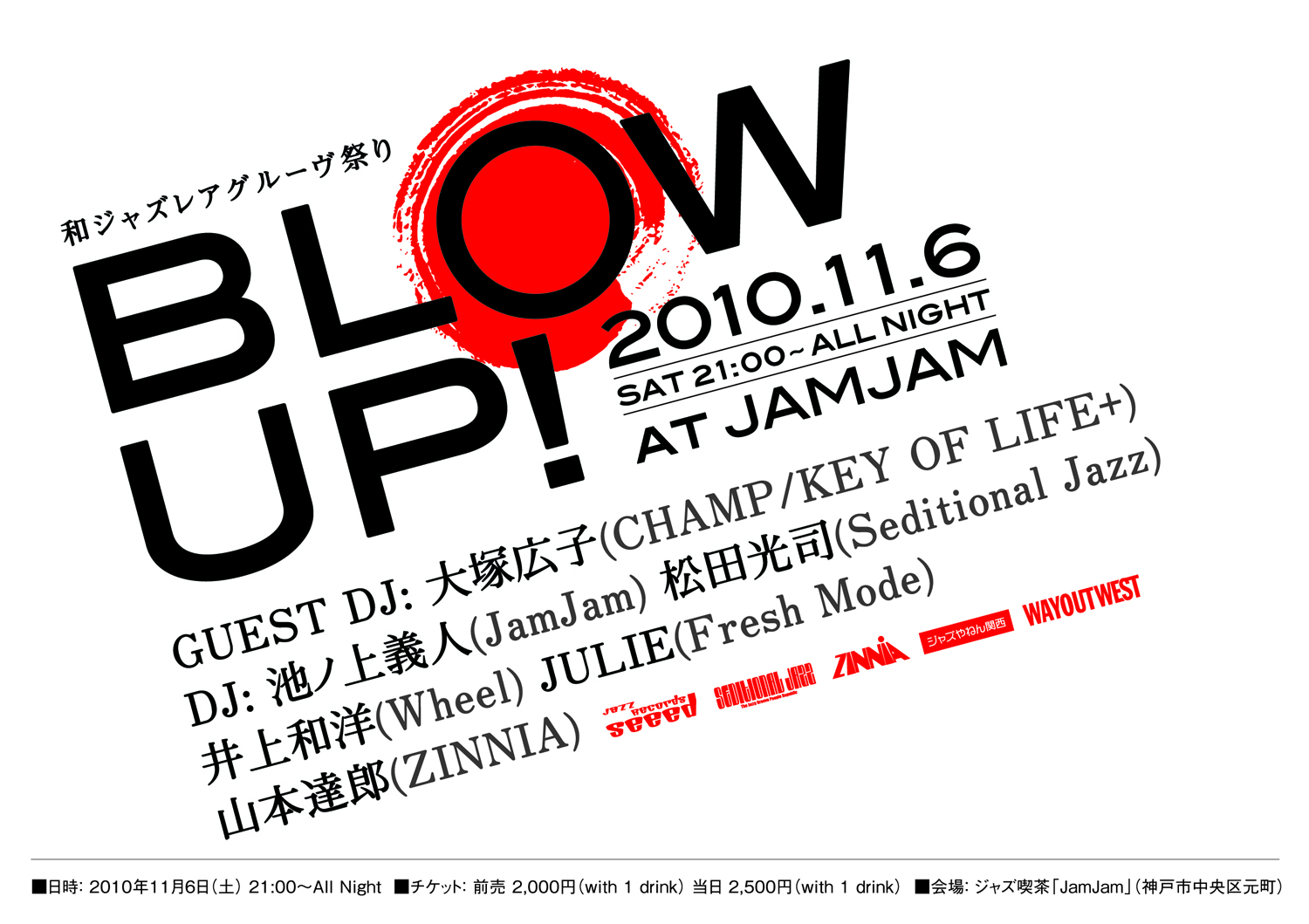 まずは、神戸唯一のJAZZ/CROSSOVERイベントSeditional Jazzから松田光司氏。長きに渡る神戸CLUBJAZZシーンをリードしてきた存在感あるプレイは必聴!そして、ここJamJamのオーナーでありJazz Around Mindでも自身の豊富な知識とセンスを発揮している池ノ上義人氏! 京都から、DEEPでSPIRITUALなJAZZをセレクトし、各方面から注目を集めている京都のDon Cherryこと井上和洋氏。別名、Ino cherry! 北野坂JAZZ STREETにある音楽BAR、KITENにてFRESH MODEという素晴らしいパーティーを主催しているJULIE氏。彼の和モノコレクションには定評があり都会的! そしてワタクシ、神戸にて生音イベントZINNIAを主催してます山本達郎、BLOW UP仕掛け人でございます。