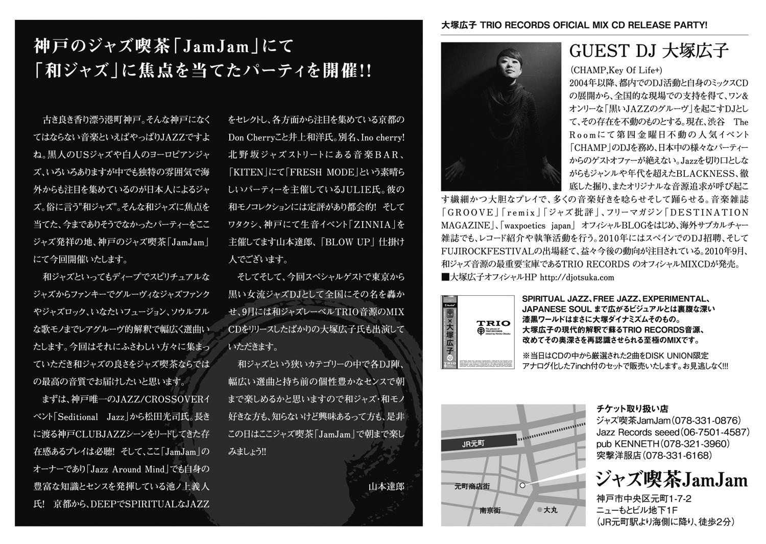 そしてそして、今回スペシャルゲストで東京から黒い女流ジャズDJとして全国にその名を轟かせ、9月には和ジャズレーベルTRIO音源のMIX CDをリリースしたばかりの大塚広子氏も出演していただきます。