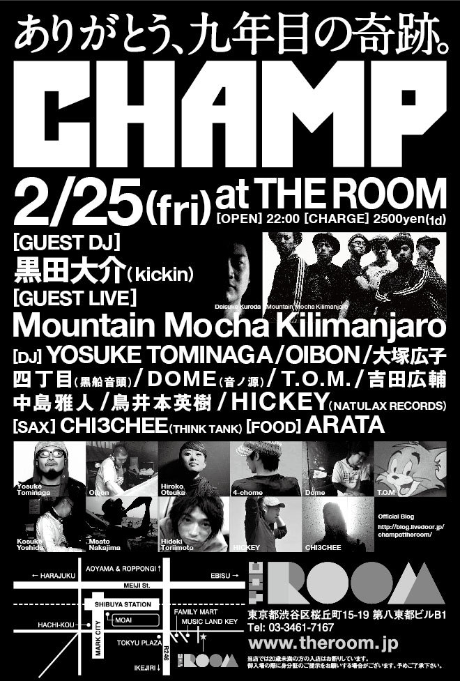 2011/03/032011/03/03に投稿 投稿者 admin — コメントを残すCHAMP 9th Anniversary!!!ありがとう!! 2/25 いよいよ 10年目にむけて。 みなさま。本当に、、 そして、CHAMP 立ち上げから トミー おいぼん ありがと。 *来月は 3/25です~~ 投稿ナビゲーション前の投稿: CHAMP 9th Anniversary!!!3次の投稿: waxpoetics~小川充『KING』×大塚広子『TRIO』HMV対談 コメントを残すメールアドレスが公開されることはありません。 ※ が付いている欄は必須項目ですコメント ※ 名前 メール サイト 次回のコメントで使用するためブラウザーに自分の名前、メールアドレス、サイトを保存する。 Δ