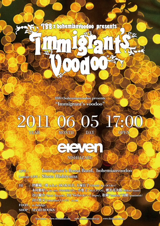 常にシーンの先陣に立ち、新たなメンバーチェンジを経て本格始動した和製ブラジリアン・ジャズ・バンドImmigrant’s Bossa Band。2010年デビューを果たし、地元横浜から音楽の素晴らしさ を発信、ライブごとに動員記録と伝説を積み重ねるライブバンドbohemianvoodoo。新進気鋭の2バンドが現在の音楽シーンに風穴を開けるべく手を組んだ最高のコラボレーションと、各ジャンルでイデオロギーを築いてきたDJ陣が強力タッグを組んでお届けするニューパーティー、「イミグランツ・ヴードゥー」!!
