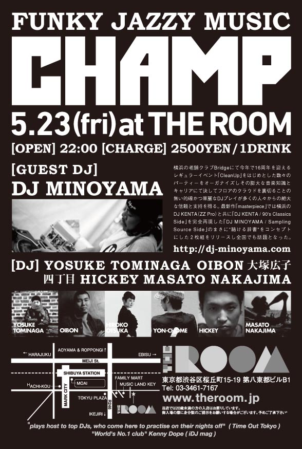 DJ MINOYAMA : 1996年からクラブDJとしてのキャリアをスタート。横浜の老舗店LOGOS看板DJ。2003年からFGクルーのCHANNELのライブDJとしても活動し、同アーティストのアルバム「デリバリー」、「1gの幸せ」にトラックメーカーとして参加する。その他、「JOY RIDE」、「Re:YOKOHAMA」、「BAY SIDE」などのコンピレーションアルバムや真衣良「観世音!ディグラー」などにも楽曲を提供。現在、98年から自らがオーガナイザーとしてスタートさせた横浜BRIDGEでの「CLEAN UP」の他、2008年の全国ツアーも大盛況であった「JOY RIDE」、1996年から続く池袋BEDでの「DYNAMITE」、 渋谷FAMILYでの「6pack」など、横浜を中心に多くのレギュラーパーティーを持ち、活躍の場を全国にまで広げている。また2007年よりシリーズ化されているMIX CD「THROW BACK」、「NATURAL RESOURCE」は、70年代のSOUL、JAZZから近年のHIP HOPまでの様々なブラックミュージックを絶妙なグルーブでミックスし、毎回全国のレコード店にて高い評価を受けている。