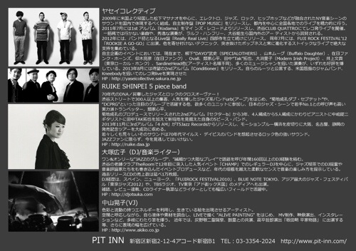 ・RUIKE SHINPEI 5 piece band:類家心平(Tp)中嶋錠二(P,Key)田中拓也(G)鉄井孝司(B)吉岡大輔(Ds)