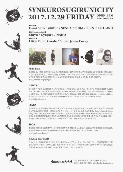 名古屋のout record 曽田さんと、同世代の最もillでblackなクロマティのDJs と一緒に、outサイドかつクラブマナーたっぷりのフィーリングをもった素晴らしいゲストを毎回迎え、年末たまりにたまったdeeeepなところを大放出する恒例大パーティ、”シンクロスギルニシテイ”いよいよ9年目です!出産直後も現地皆さんのご協力でブランクなくやってこれました。感謝です。名古屋ならではのナチュラルなパーティ感とデトロイトに通じる漆黒感、トレンド一切関係なしの独自チームの文化が感じられる最高の一夜です!