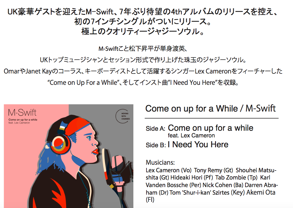 2016年末の私のコンピレーション『PIECE THE NEXT JAPAN BREEZE』で、未発表曲として収録させてもらったM-Swift =松下昇平氏の音源「Come on up for a while」が、とうとう7インチとなってリリースされます!